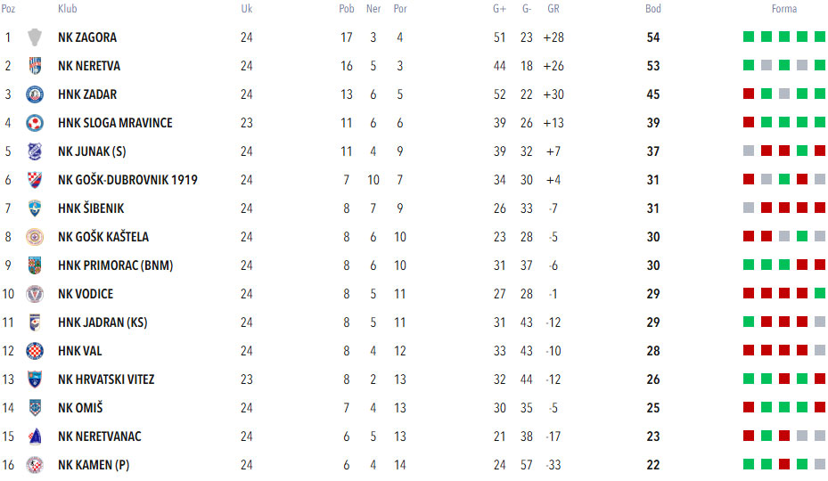 Unatoč uvjerljivoj pobjedi, stanje na vrhu ljestvice ostaje nepromijenjeno. NK Zagora Unešić također je upisala pobjedu protiv Omiša te i dalje drži prvo mjesto s 54 boda, dok Neretva ima samo bod manje (53). Trećeplasirani Zadar zaostaje osjetnije s 45 bodova.