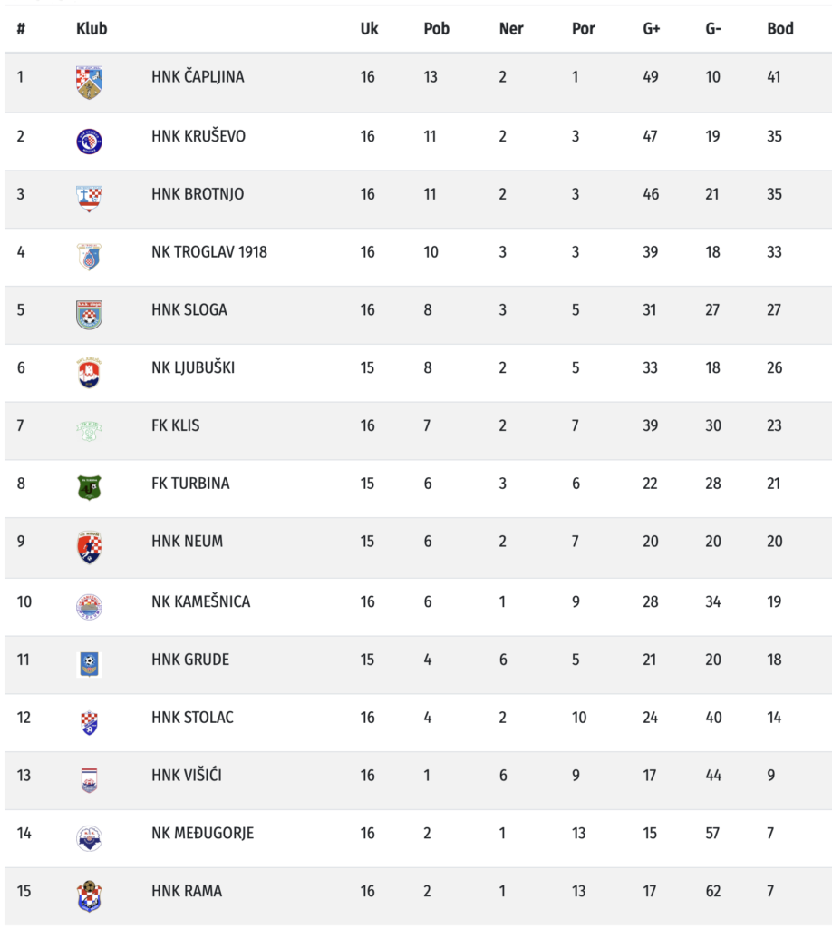 Ovom pobjedom Brotnjo je stiglo do 35 bodova i bodovno se izjednačilo s Kruševom, dok je na vrhu ljestvice Čapljina s 41 osvojenim bodom.